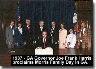 In 1987, Georgia Governor Joe Frank Harris signs proclamation honoring the Morris Family's contribution to the music industry and proclaims "Morris Family Week".